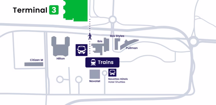 Le Terminal 3 se trouve à environ 5 minutes à pied, tandis que les terminaux 1 et 2 sont accessibles en 10 minutes environ grâce à la navette automatique CDGVAL, depuis la station Terminal 3-Roissypole.