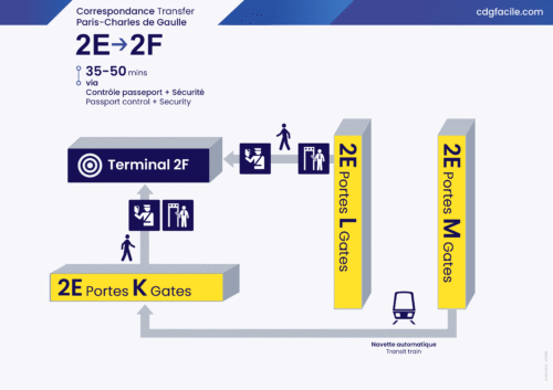 Selon votre lieu d’arrivée au Terminal 2E (K, L ou M), retrouvez ci-dessous les différents itinéraires pour rejoindre le Terminal 2F.