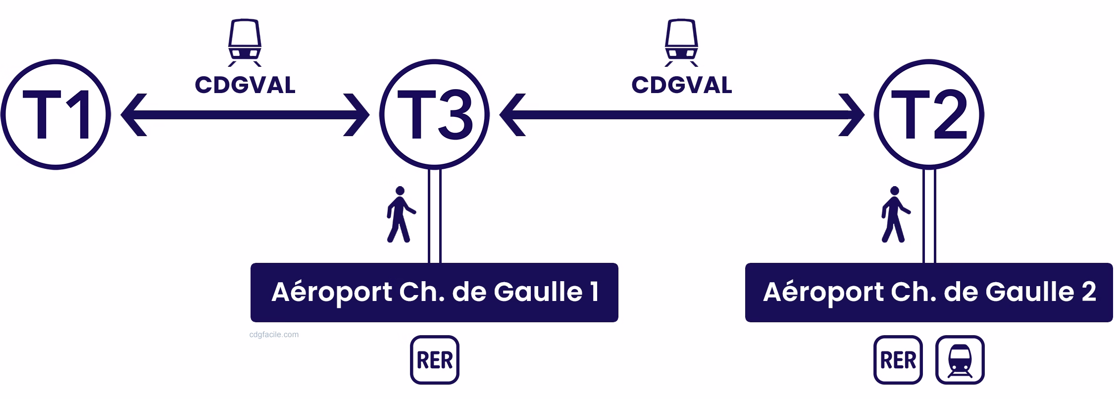 La navette automatique CDGVAL, gratuite, est le seul moyen pour se déplacer en zone publique entre le Terminal 1, le Terminal 2 et le Terminal 3/Roissypole.