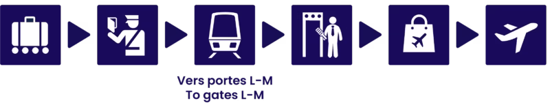 Rendez-vous au niveau Départs, consultez les écrans d’information dans le terminal pour connaître la zone d’enregistrement et la porte d’embarquement (K.. ou L.. ou M..) dédiées à votre vol.