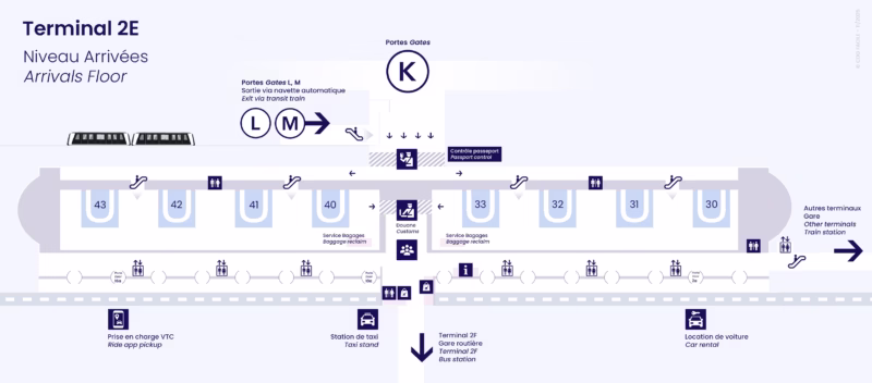 Suivez les indications Sortie-Bagages dès votre arrivée. Les passagers débarquant aux Portes L et M utilisent une navette automatique pour rejoindre le bâtiment principal (attenant aux Portes K).
